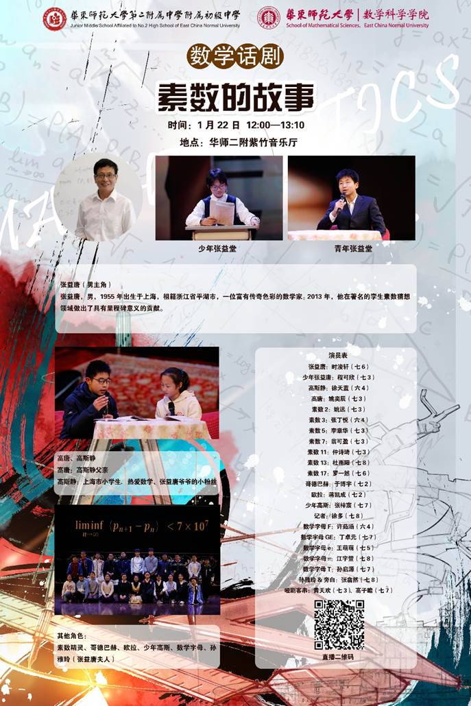 原创数学话剧《素数的故事》以张益唐先生的数学传奇人生为主线,讲述和呈现了素数星空下的七彩故事。这里收藏的是2021年1月22日的这一数学话剧的直播回放视频。本次活动由澳门六合彩资料大全-澳门六合彩官网资料 与华东师大二附中附属初中联合主办。